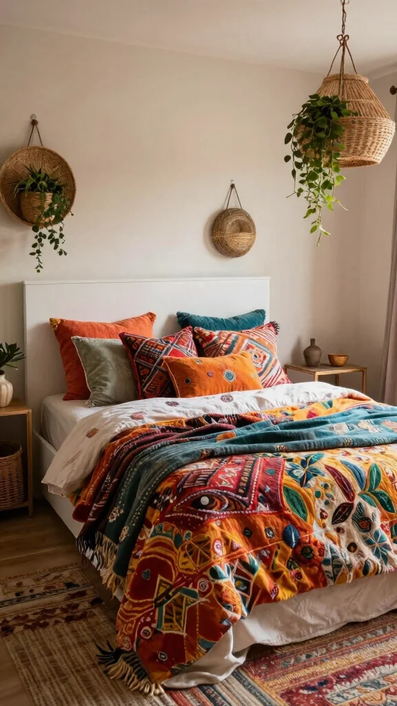To achieve this boho look, incorporate a variety of patterns while maintaining a consistent color scheme to tie everything together. Adding elements like woven baskets or macrame hangings can further enhance the theme, creating a cozy, artistic vibe.