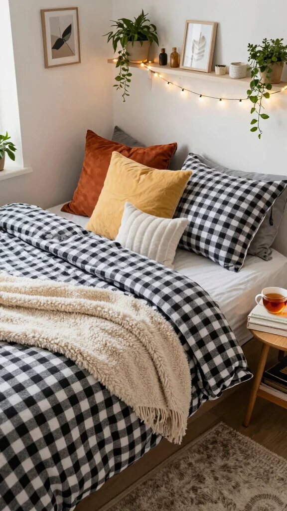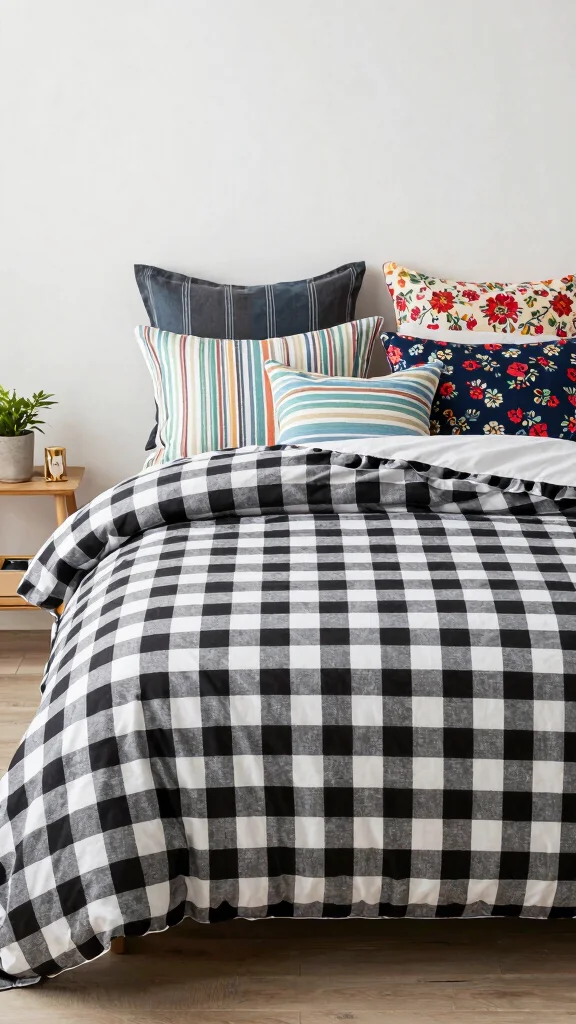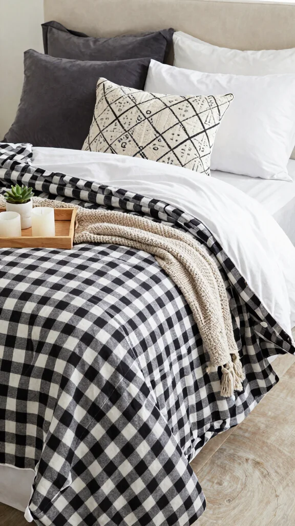 Layering different textures with black and white gingham bedding can transform your bedroom into a cozy haven. Begin with a gingham duvet cover as the base, and add a chunky knit blanket at the foot of the bed for a stunning contrast. This interplay of textures draws the eye and invites you to snuggle in.