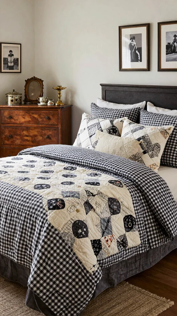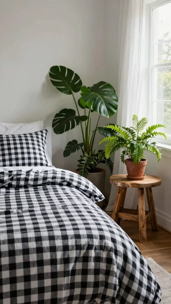 Embrace a monochrome palette with natural textures: linen sheets, a slate or warm beige wall, and weathered wood furniture. Pair black and white gingham bedding with solid charcoal or cream textiles to keep things balanced. Add rustic home accessories like iron accents, jute rugs, and woven baskets. Introduce subtle pattern variety through one additional pattern (like a thin striped lumbar pillow) rather than multiple prints. Finish with simple greenery and soft, ambient lighting to enhance classic charm.