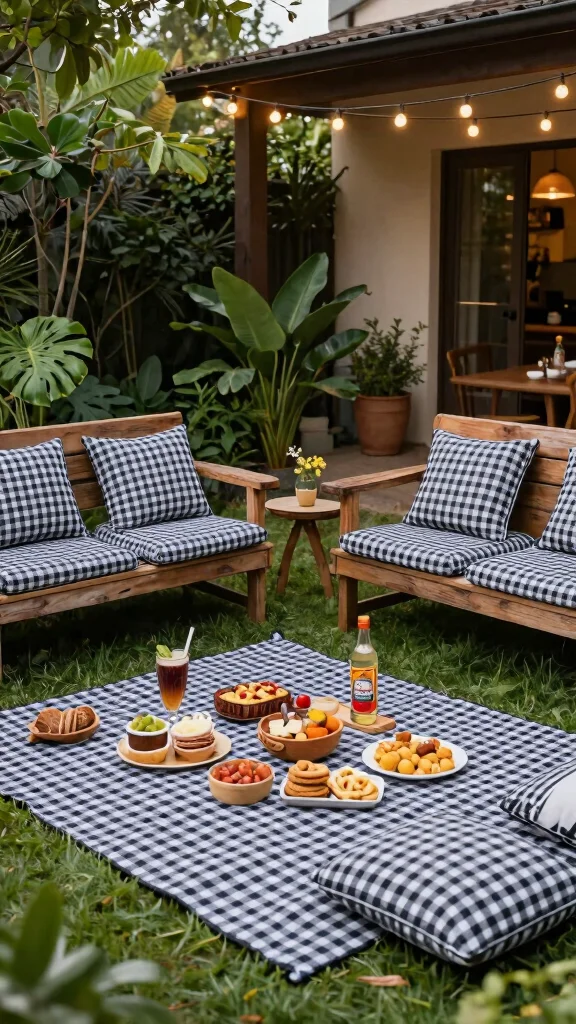 Outdoor spaces crave cozy charm too. Black and white gingham bedding vibes turn patios into inviting lounges—pair gingham cushions with wood or wicker, add string lights, and you’ve got a warm, welcoming spot for easy outdoor gatherings.