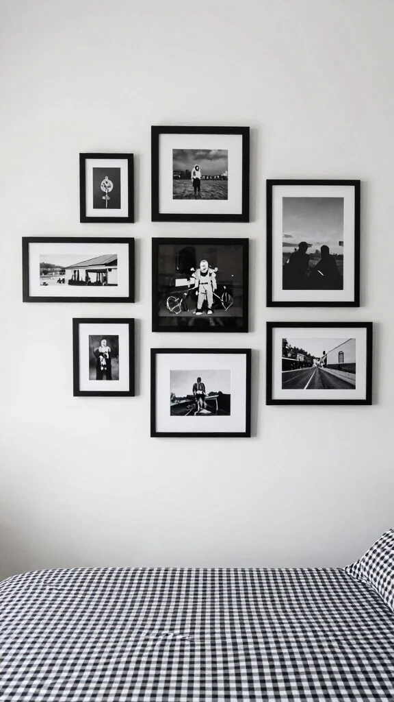 Arrange your frames in a grid or a more freeform style to keep things dynamic. Including varying sizes and shapes will keep the display interesting and engaging. Introducing a few colorful frames or pieces can add a surprising touch, allowing your gingham bedding to remain the focal point.