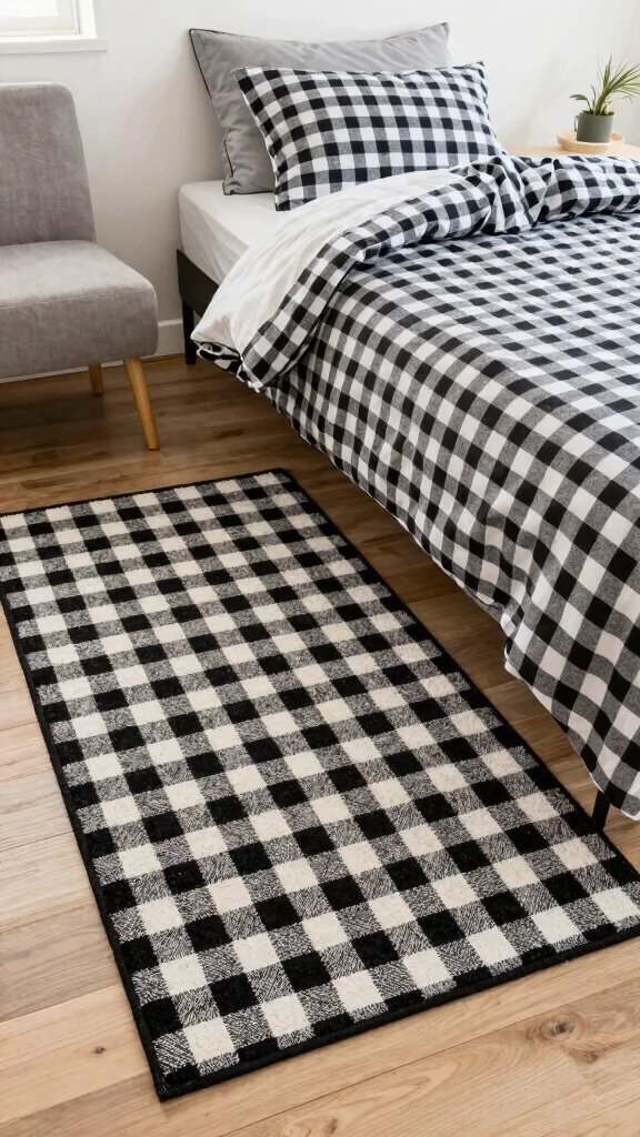 Adding an accent rug featuring a gingham pattern can beautifully tie your room together, especially with black and white gingham bedding. This addition provides depth and comfort underfoot, enhancing the overall decor.