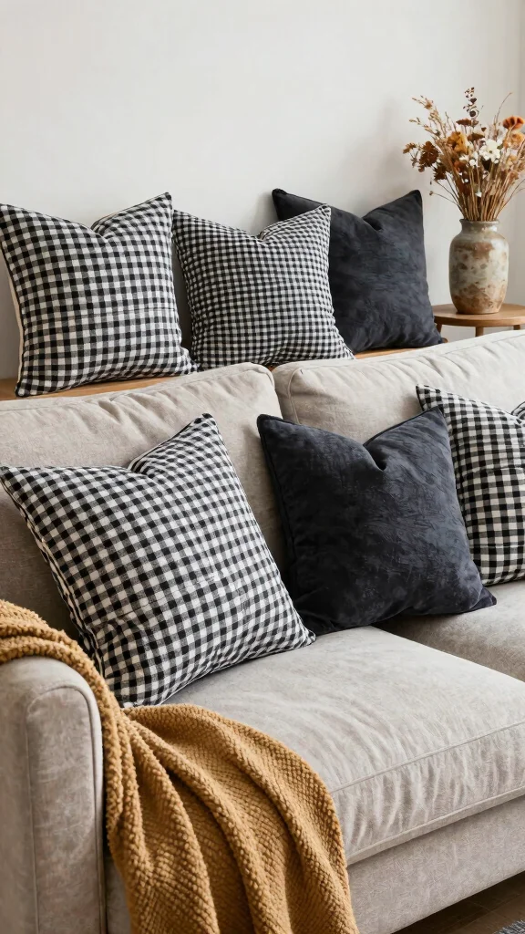 How can I use gingham throw pillows to enhance black and white gingham bedding without overwhelming the room?