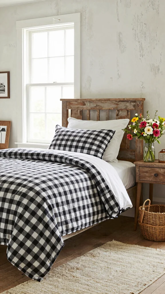 What are the best ways to style black and white gingham bedding in a rustic farmhouse bedroom?