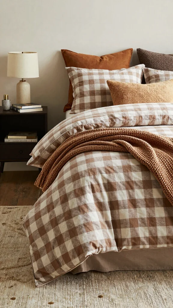 Start with a few gingham throw pillows in different scales, anchored by solid white accents. Place larger checkered pillows at the back and smaller ones in front for depth, and keep the rest of the bed simple with crisp sheets. Mix textures like linen, cotton, and a knitted throw to add warmth without adding competing patterns. Bring in rustic touches such as a wooden headboard or wicker basket to keep the look grounded. If you want extra continuity, include a single checkered duvet cover on a secondary bed or seating area, tying the room together while staying tasteful.