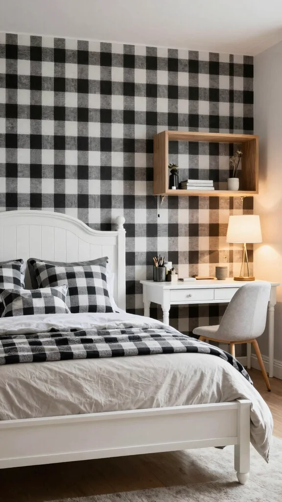 Accent walls with gingham create instant charm you can refresh anytime. Pair them with white or natural wood furniture, and add removable wallpaper swatches for easy updates—it’s an effortless, timeless look that complements black and white gingham bedding.