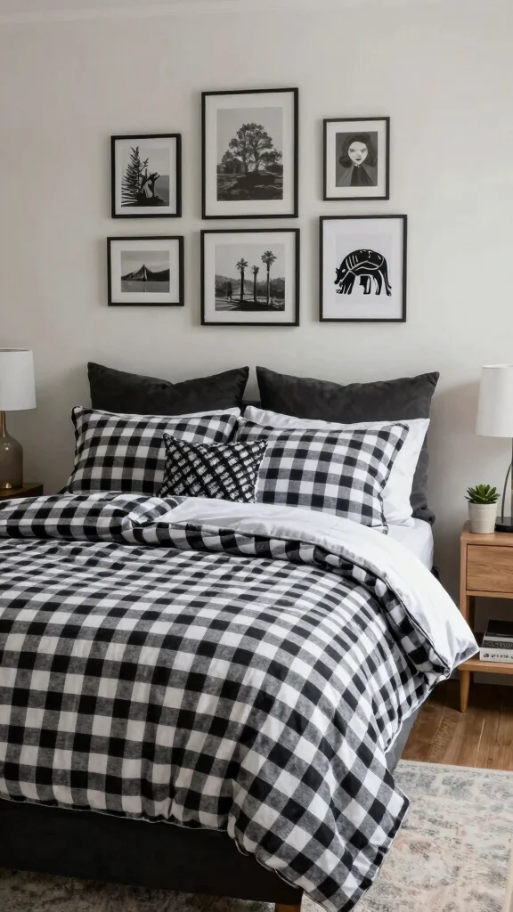 Creating a monochrome gallery wall can beautifully complement your black and white gingham bedding. Use a mix of black and white photographs, art prints, and mirrors to create an eye-catching display that enhances your decor. The combination of textures and shapes adds visual interest and depth to your space.