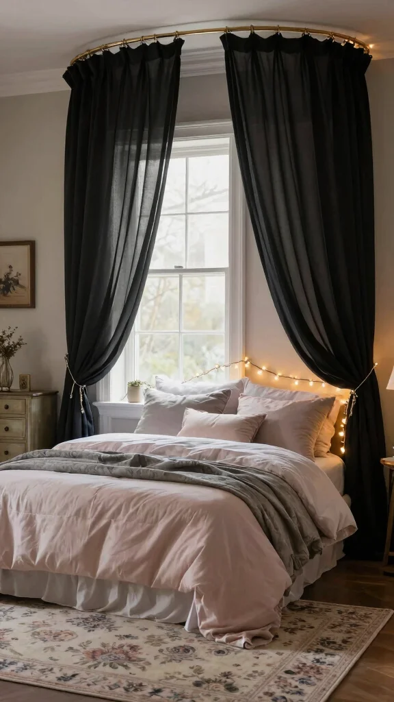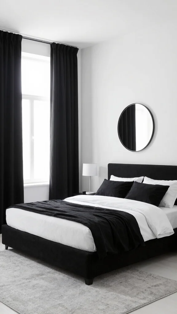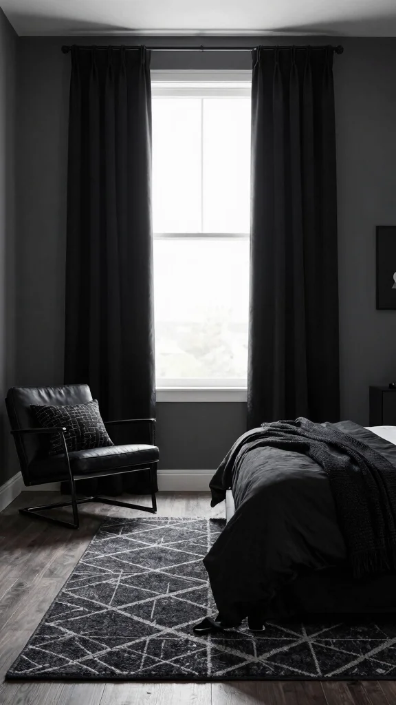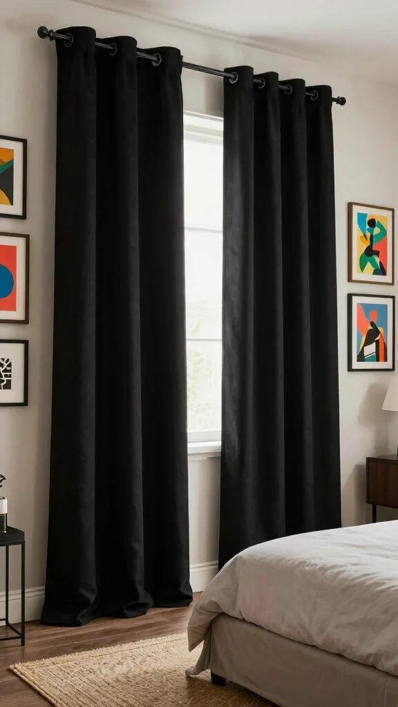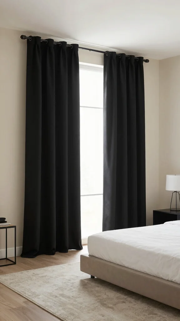 Utilizing floor-to-ceiling black curtains instantly adds a sense of drama and sophistication to your bedroom. This striking design choice enhances the perception of height, creating an expansive feel while framing your windows beautifully. When combined with light-colored walls, this combination not only highlights the curtains but also brightens the overall space, making it feel more open and airy. Imagine pairing these curtains with soft white bedding and warm wood accents for a harmonious look that exudes elegance.