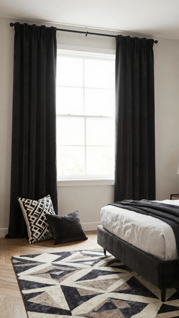 Integrating bold geometric patterns with black curtains can introduce a modern twist to your bedroom. Opt for designed rugs, cushions, or wall art that create a dynamic visual effect, enhancing the overall aesthetic. Choosing complementary colors within the geometric prints can unify the look, ensuring the decor feels cohesive and intentional.