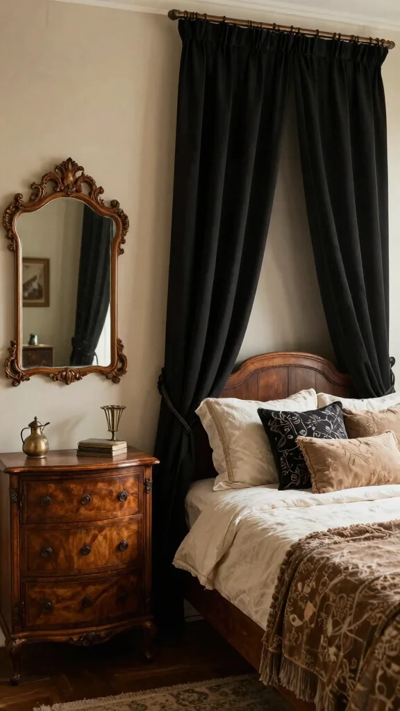 Combining vintage elements with black curtains can create a unique and inviting atmosphere in your bedroom. Consider integrating antique furniture with contemporary decor to achieve a balanced and eclectic look. Vintage light fixtures or decorative pieces can beautifully complement the boldness of the black curtains, adding layers of warmth and interest to the room.