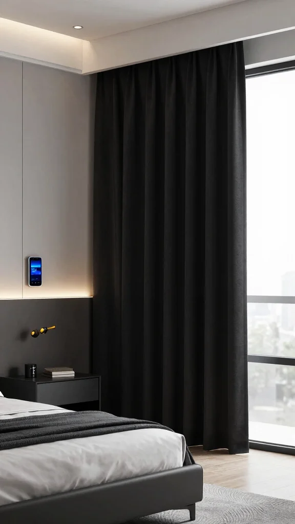 Fun fact: Smart curtain automation can cut energy use by up to 15% in black curtains bedroom ideas, simply by optimizing natural light with a tap. Pair this tech with sleek, minimalist furnishings, and your bedroom becomes a cohesive, luxurious oasis—effortless and smarter.