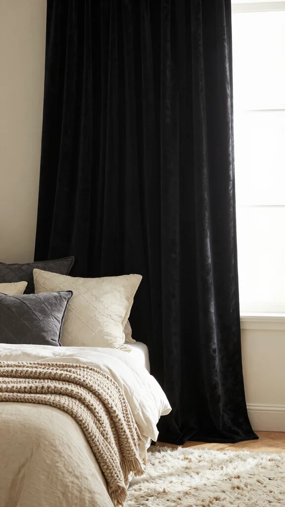 – Pair velvet black curtains with textured bedding for richness