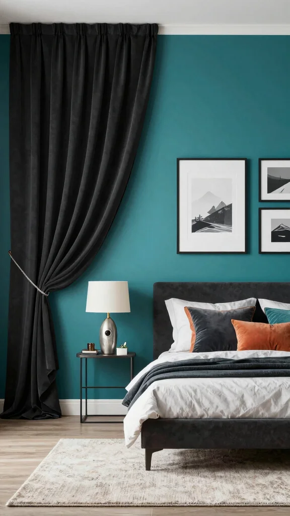 Bold accent walls with black curtains create instant drama. Choose deep jewel tones or charcoal to anchor the room, and let the curtains shine as the focal point. Harmonize hues with your black curtains bedroom ideas for a luxe, balanced minimalist retreat.