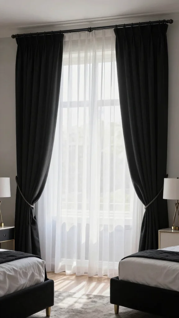 Layering curtains is an excellent way to add depth and flexibility to your room’s design. Start with sheer white curtains to let in soft light, then overlay bold black curtains for a striking contrast. This combination allows you to control light levels while creating a visually appealing look that works for any time of day.
