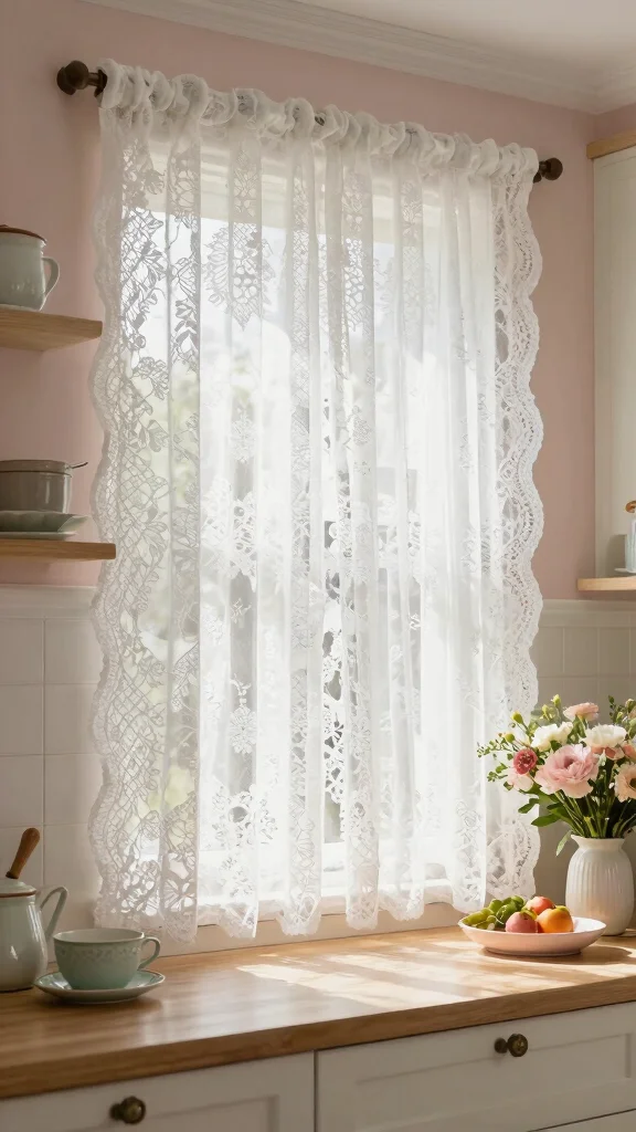 Opt for lace cafe curtains to add a soft, vintage touch while filtering natural light in your kitchen.