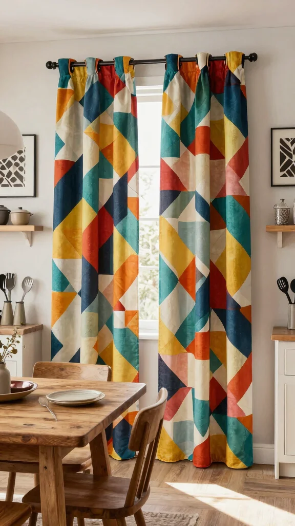 Bold geometric patterns wake up your kitchen and pair beautifully with cafe curtains in kitchen. Choose a dominant color that complements vintage furnishings, then mix shapes for energy without clutter. Repeat the hue in accessories to keep the look cohesive and practical.