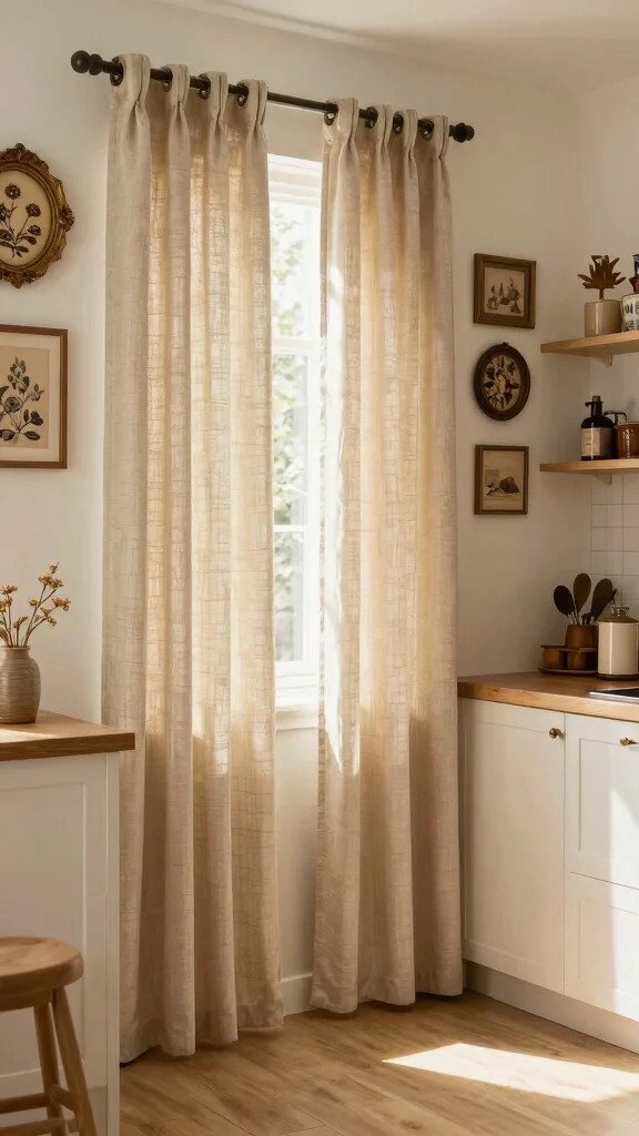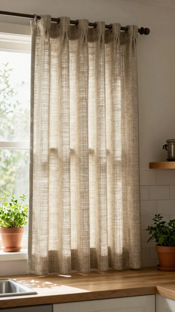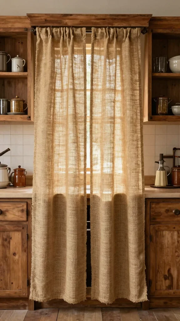 Rustic Burlap Options: If you enjoy a farmhouse aesthetic, burlap curtains bring warmth and an earthy feel, perfect for cozy kitchens.