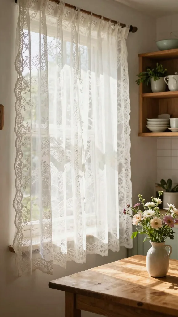 – Pair lace curtains with wooden shelves for a charming touch.