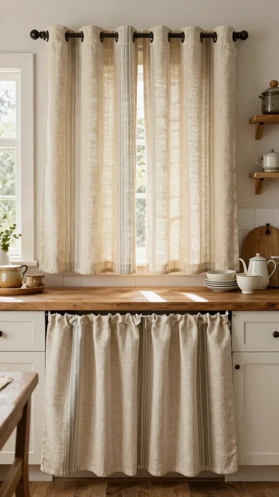 Grain sack curtains can create a warm, inviting kitchen atmosphere, making it a lovely spot for meals and gatherings.