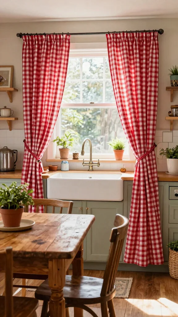 – Pair checkered curtains with rustic kitchen accessories.