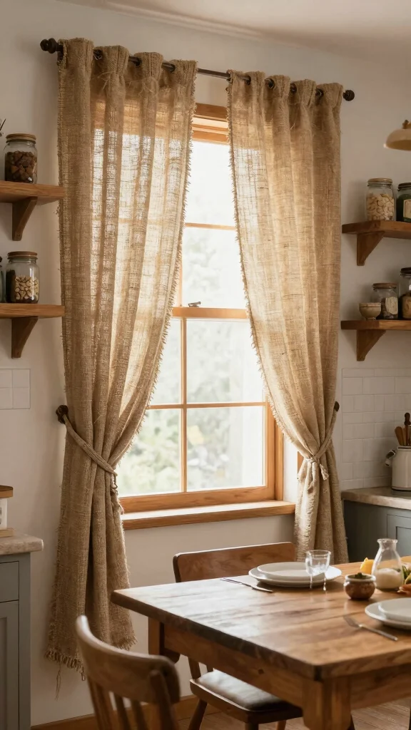 Burlap curtains enrich your kitchen’s rustic charm, creating an inviting haven for family and friends.