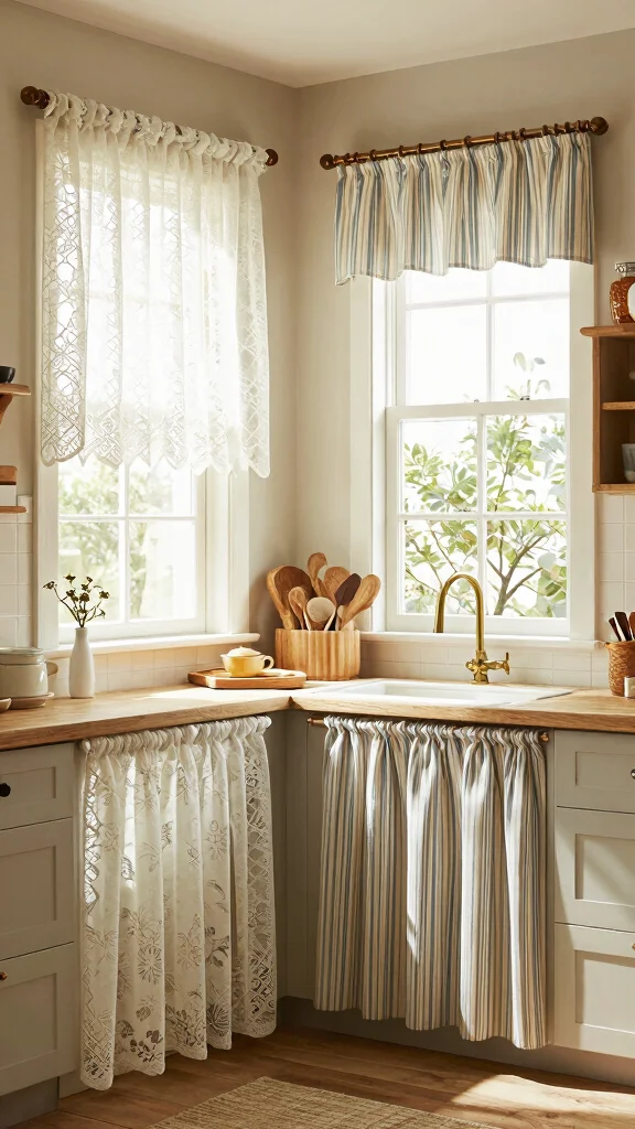Fun fact: striped cafe curtains can visually expand a kitchen by up to 20%, especially when paired with solid colors. Layering adds depth and balances bold stripes for a modern look or soft tones for vintage charm in cafe curtains kitchen ideas.