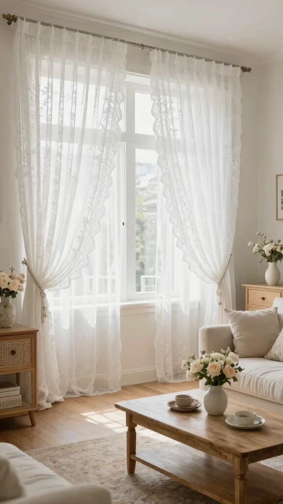 Pair lace curtains with wooden blinds for added privacy when needed. Opt for neutral or pastel colors to maintain a light, airy feel, and accessorize with floral arrangements or vintage decor for a complete, enchanting look.