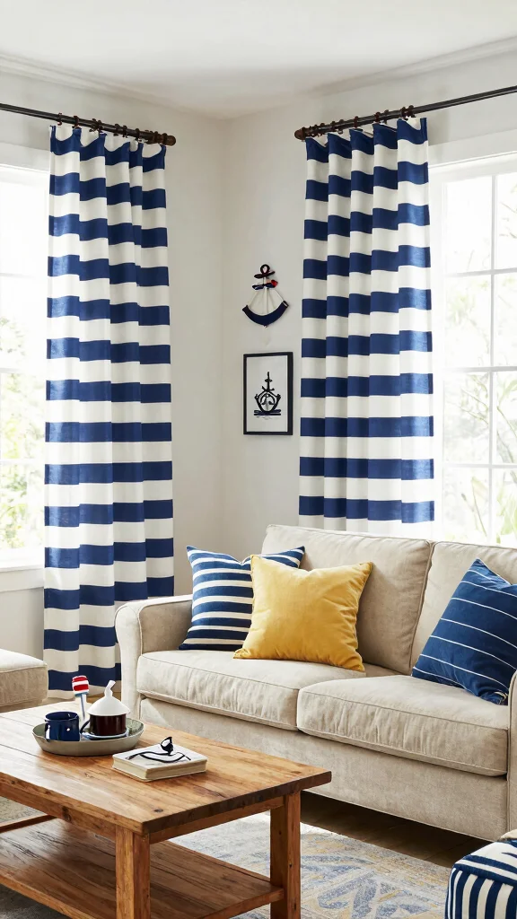 For a cohesive look, opt for curtains featuring vertical stripes to accentuate your ceilings. Mix these with solid color furnishings to maintain balance and avoid overwhelming patterns. Natural fiber curtain ties can further enhance the nautical theme and keep the aesthetic uniform.