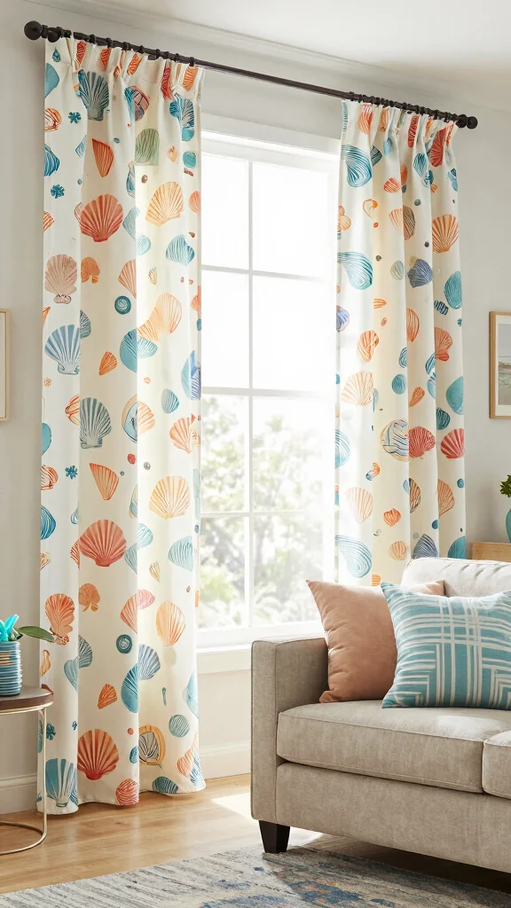 Patterned panel curtains provide a fun and lively accent to your coastal living room. Often featuring motifs like anchors or seashells, these curtains celebrate beachy decor with a playful spirit. They can serve as vibrant focal points while harmonizing beautifully with other textures and materials. To maintain balance, pair patterned panels with solid-color furniture, allowing the designs to stand out without overwhelming the space.