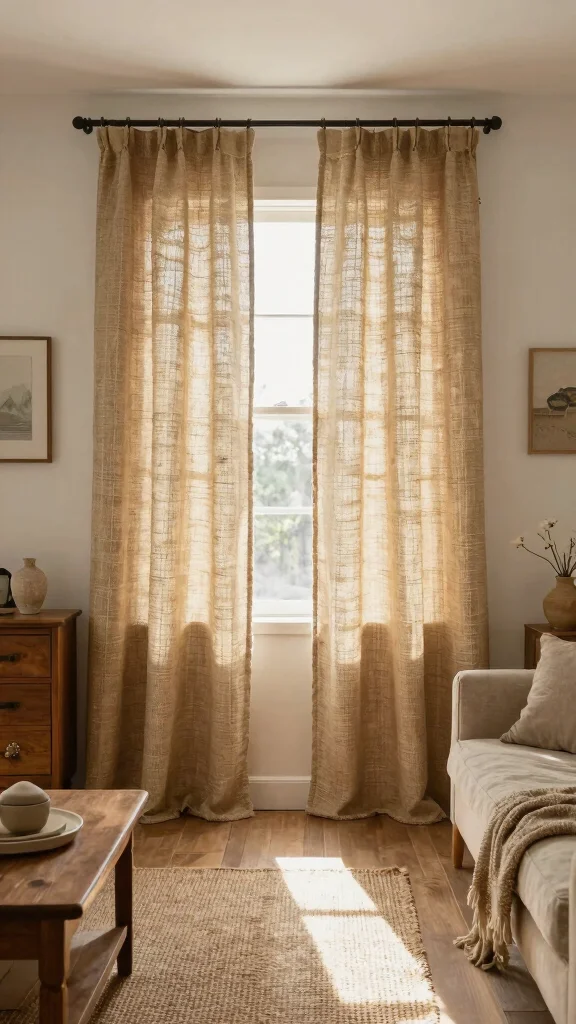 Enhance the rustic appeal by using burlap curtains with a slight ruffled edge for added softness. Pair them with vintage or reclaimed wood furniture to strengthen the authentic feel, and incorporate soft, neutral shades to maintain a relaxing atmosphere.
