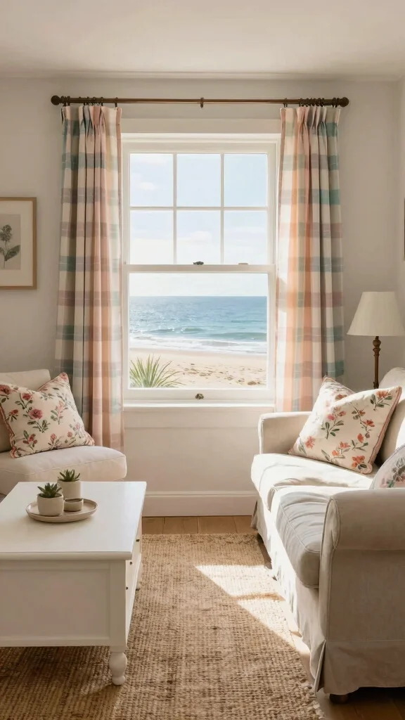 Best fabrics: linen, cotton, and light blends for airflow. Colors: whites, creams, seafoam greens, soft blues, sandy beiges. Patterns: thin stripes, small nautical motifs, subtle seashell prints; keep patterns to one window treatment or a pair to maintain balance. For an elegant coastal look, combine solid neutral curtains with a patterned throw or pillow that picks up a color from the curtains. This stays within go-to guidelines and ensures the curtains living room remains stylish.
