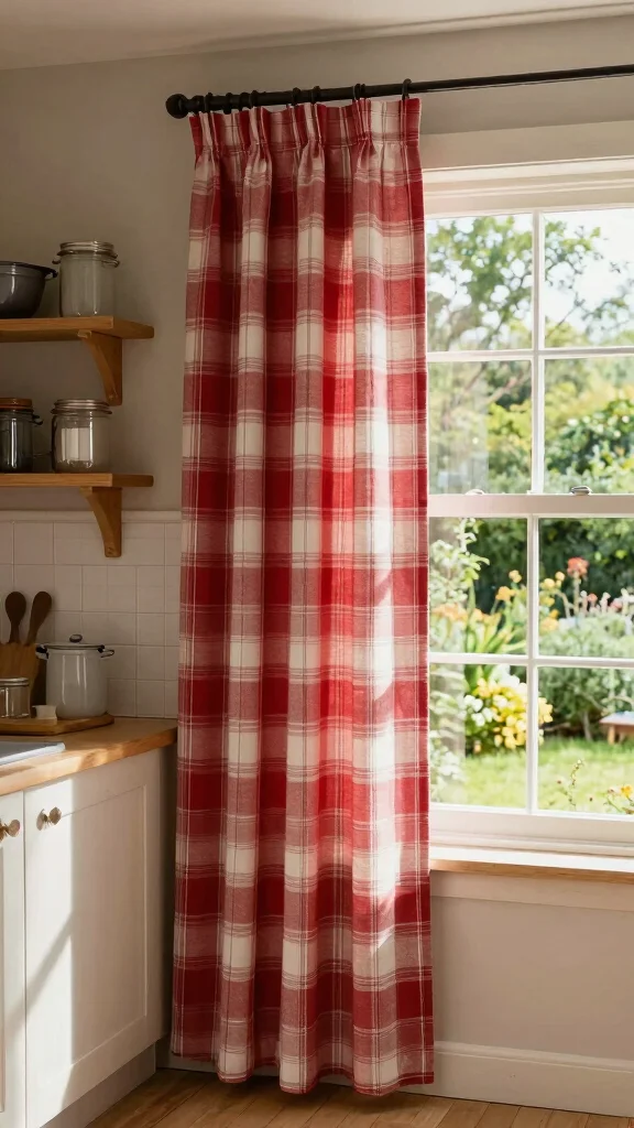 Pair with wooden accessories and vintage kitchen items to enhance the rustic aesthetic. You can find plaid options at fabric stores or online.