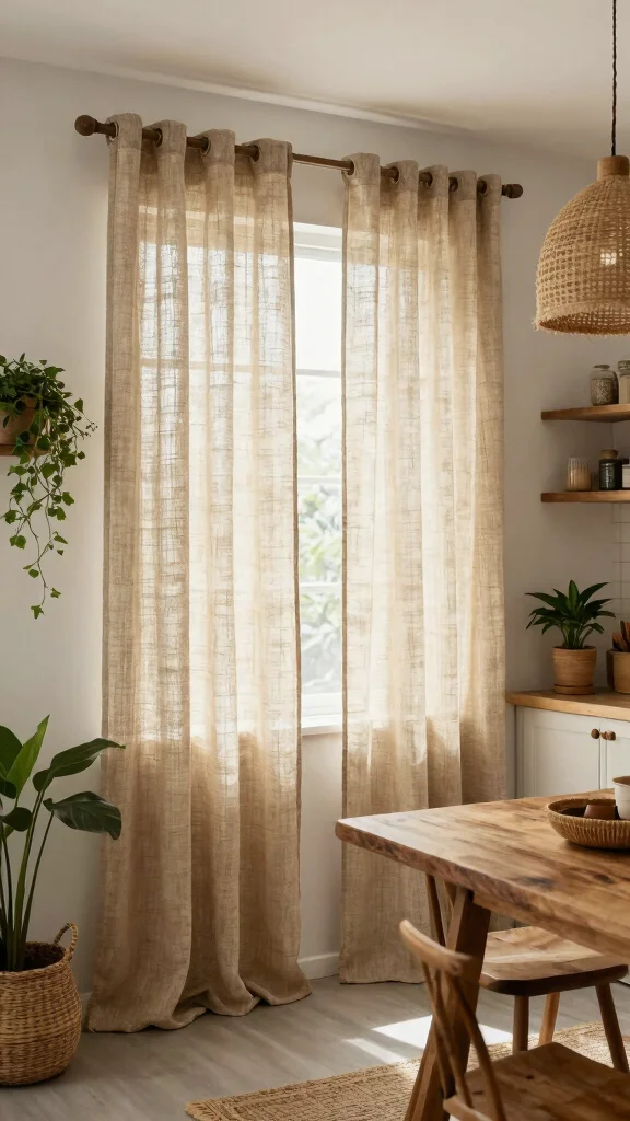Natural jute curtains are an ideal fit for a bohemian kitchen aesthetic. These curtains introduce a unique texture and earthy quality, complementing other natural materials like wood and stone. Their durability ensures longevity while being breathable, creating a comfortable atmosphere. Choose lighter shades to maintain an airy feel or darker tones for a dramatic touch.