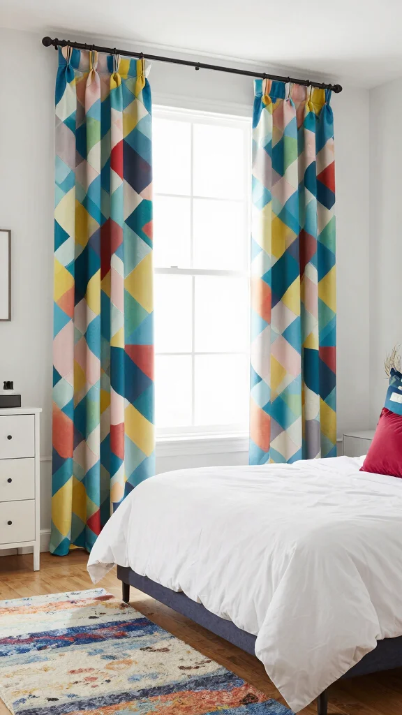 Add personality to your bedroom with bold geometric patterned curtains paired with white bedding. This stylish combination infuses energy and modern design elements into your space, creating a vibrant atmosphere. Geometric patterns can be designed in various colors, like black and white or soft pastels, ensuring a cohesive look.