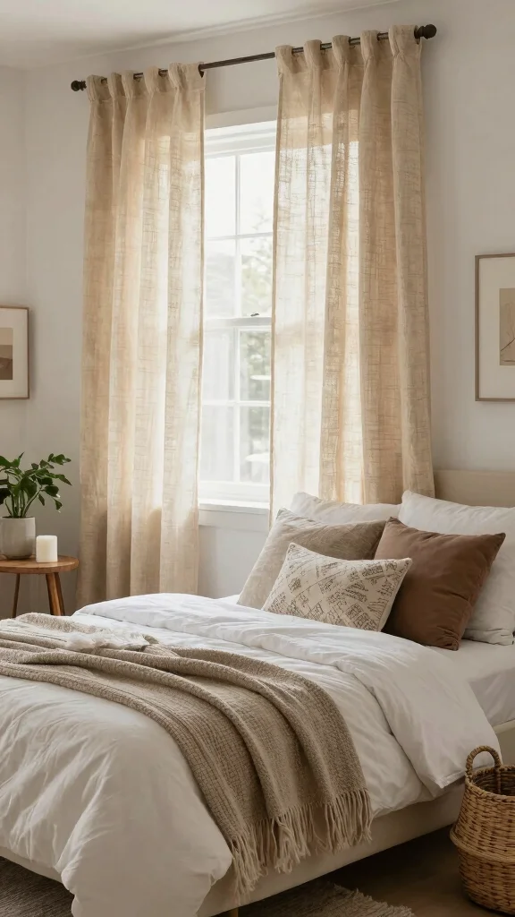 Embrace eco-friendliness with natural fiber curtains that beautifully complement white bedding. Materials like jute, bamboo, or organic cotton not only look stunning but also promote sustainable living. These curtains introduce texture and warmth to your bedroom, creating an inviting environment.