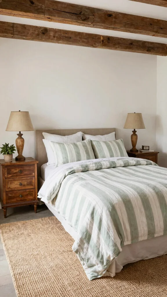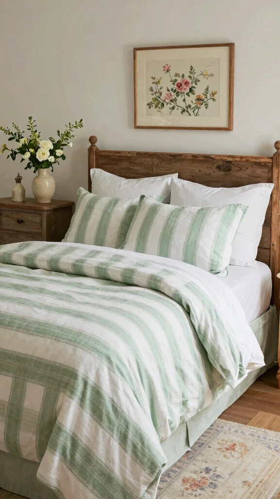 Embrace the rustic charm of farmhouse style with green and white striped bedding that enhances your cozy space. The gentle hues of muted greens paired with classic stripes create a harmonious look that feels both inviting and timeless. Imagine a bed adorned with these stripes, surrounded by natural wood elements like nightstands and woven baskets. This combination evokes a sense of comfort, making your bedroom a warm retreat.To implement this style, consider soft, neutral-toned walls that allow the bedding to shine. Incorporate decorative greenery through potted plants or fresh flowers for an organic touch. Choose natural fabrics such as cotton or linen to maintain an eco-friendly approach.Consider these elements to maximize this palette’s potential: