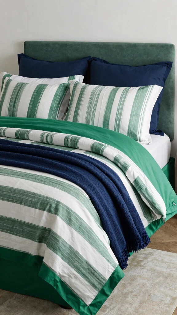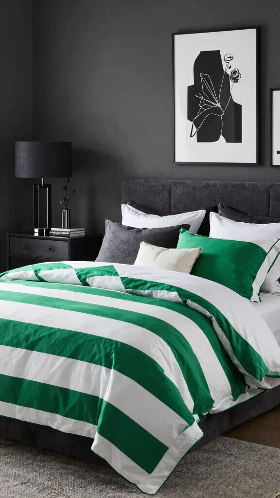 For a striking and upscale appearance, opt for bold green and white striped bedding combined with darker contrasting colors like charcoal or deep green. This sophisticated approach creates a dramatic effect that stands out in any bedroom. It not only draws attention but adds a sense of luxury and contemporary flair to your space.To achieve this look, use darker sheets or a bed skirt to ground the bedding, and incorporate bold artwork that complements the color scheme. Metallic or glass accents can add a refined touch without overwhelming the space.Consider these contrast ideas: