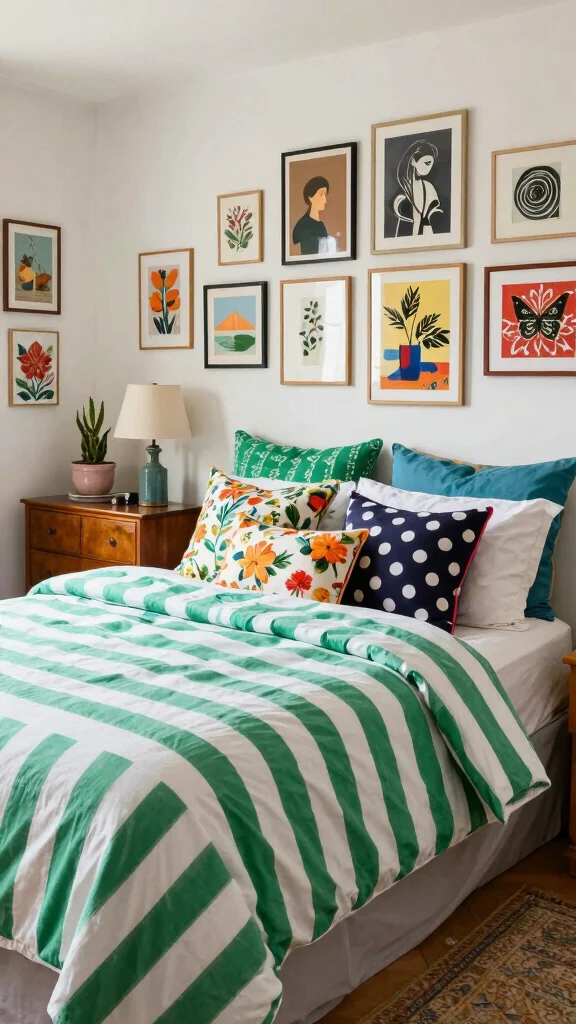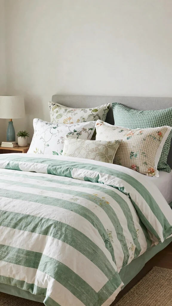 Blend soft patterns to create a unique and eclectic vibe in your bedroom with green and white striped bedding. Mix it with pastel floral or checkered designs for a delightful fusion of styles. Balance is essential; maintain a consistent color palette while varying textures and patterns to create a chic and inviting space.To achieve this look, stick to a similar color palette for cohesion, and incorporate varied textures for added visual interest. Use large-scale patterns sparingly to avoid overwhelming the room, ensuring a harmonious blend.Consider these mixing patterns tips: