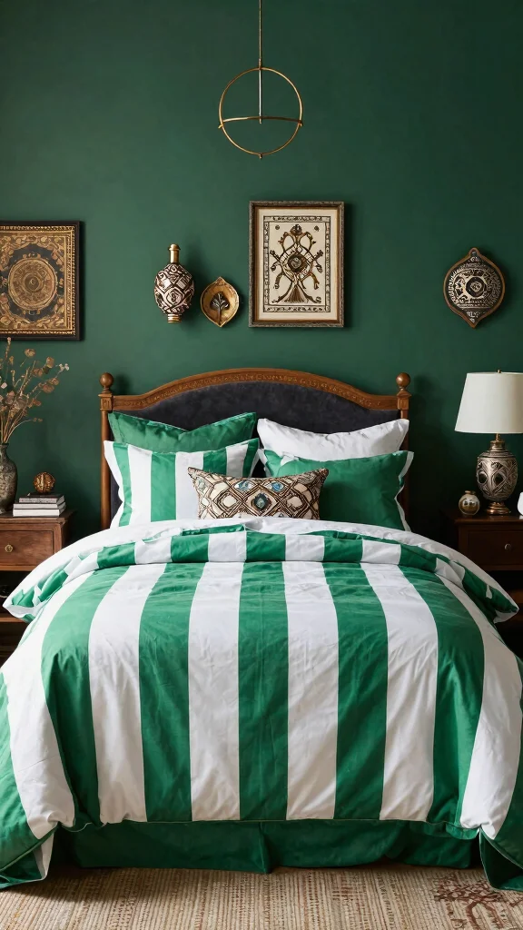 Infuse your bedroom with global flair by pairing green and white striped bedding with decor inspired by different cultures. Select bedding that features traditional patterns or textures and mix them with local textiles for an eclectic yet harmonious look. This style reflects your travels and experiences, making your space uniquely yours.To enhance this theme, choose decor pieces that resonate with you, such as Moroccan poufs or Indian tapestries. Use rich textures like silk or woven fabrics to elevate the global feel, and incorporate decorative elements from around the world for a well-traveled ambiance.Incorporate these global influences: