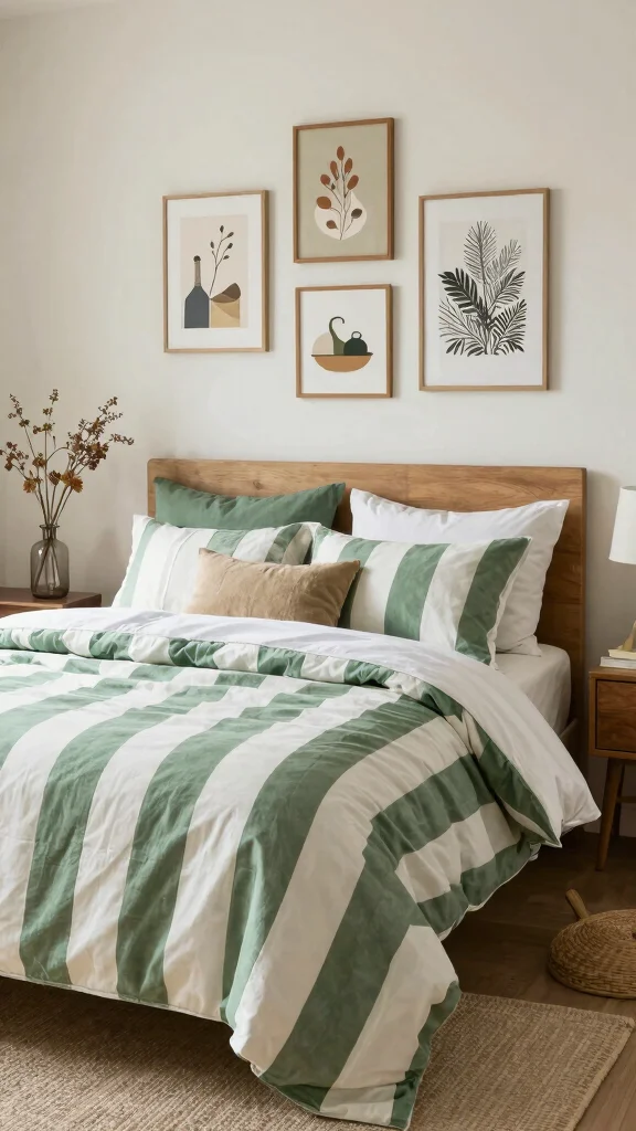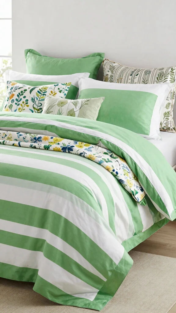 ❝ Artful green and white striped bedding invites calm, color, and creativity in your space. Use bold wall art and painterly accents to tie the look together. Start small: swap in one graphic pillow and layer textures for a vibrant, eco-friendly retreat.