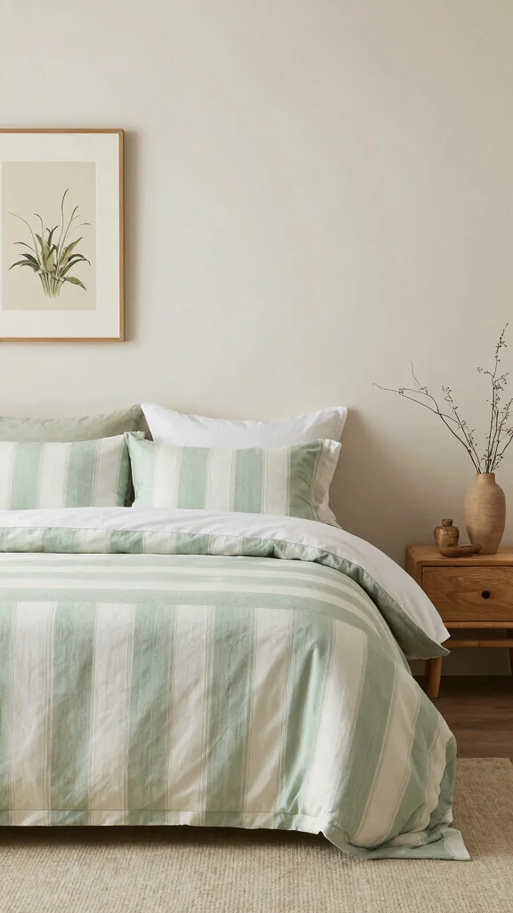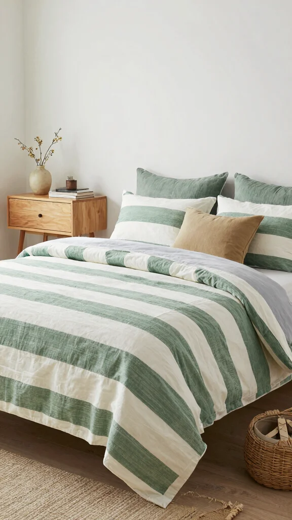 Green and white striped bedding ideas come to life when you prioritize sustainable materials and thoughtful styling. Choose organic cotton or linen sheets, or blends like bamboo and TENCEL Lyocell for a soft, durable base. Mix wide and narrow stripes for visual interest and consider a reversible duvet to switch looks without buying more. Pair with green and white decor accents like plants or solid sage throws to keep the palette cohesive. For a modern touch, keep walls light and add natural wood furniture to anchor fresh bedroom styles with bedding color schemes that feel sustainable.
