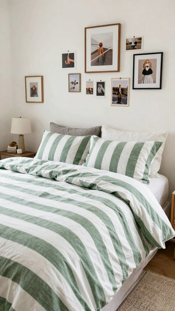 Finally, infuse your unique personality into your green and white striped bedding setup. Use accent pillows in your favorite colors, or create a gallery wall showcasing your treasured memories and inspirations. This individuality transforms your space into a true sanctuary that feels authentically you.Incorporate personal items like travel souvenirs or family photographs to make the room special. Custom-made pillows and artwork that resonate with your style can turn your bedding into a conversation starter.Consider these personal touch ideas: