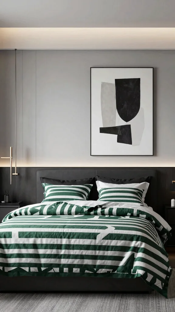 For a sleek and modern aesthetic, green and white striped bedding can elevate your bedroom’s design significantly. Opt for bold geometric stripes combined with minimalist furniture to create a clean and spacious feel. The simplicity of this color palette, enhanced with shades of gray or black, will give your space a sophisticated edge.To achieve this look, select oversized wall art that echoes the striped theme. Monochromatic accessories in gray or black will maintain the modern vibe while incorporating metallic accents like a gold lamp for a touch of glamour.Use these tips to enhance your modern space: