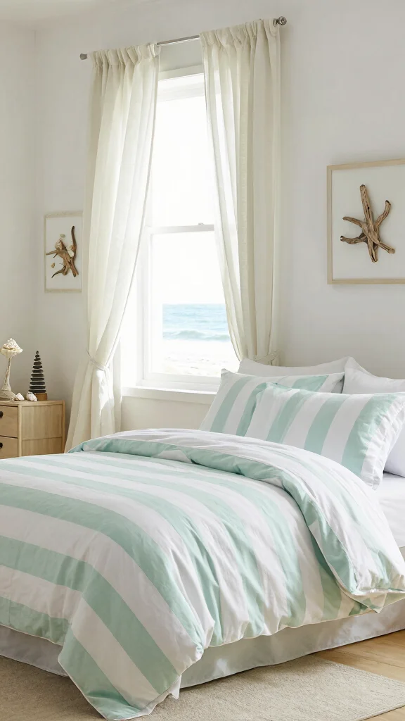 Infuse your bedroom with the breezy essence of the beach by selecting coastal-inspired green and white striped bedding. Soft, pastel shades evoke a serene atmosphere reminiscent of sandy shores, perfect for a relaxing retreat. Pair your bedding with nautical-themed decor like seashells and light, airy curtains that dance with the breeze, creating a tranquil space.Enhance this style by adding textures such as linen and cotton to reinforce the beachy feel. Integrate natural elements like jute or wicker in your decor choices, and use shades of blue or sandy beige to complement the green and white stripes.Consider these coastal elements: