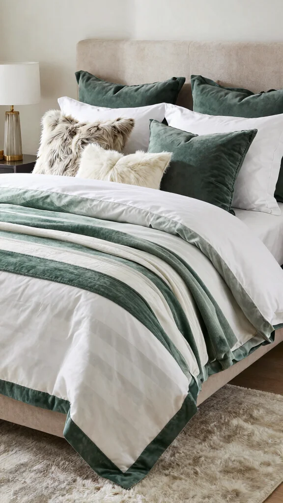 Create a sumptuous bedroom look with layered green and white bedding that invites comfort and elegance. Start with a crisp white duvet, then add a green and white striped quilt for a chic, inviting touch. Incorporate various textures, such as velvet or faux fur, with accent pillows and throws to create depth and warmth, making your space feel cozy for chilly nights.To enhance this layered look, use a mix of pillow sizes for dimension and choose fabrics that harmonize, like silky sheets paired with chunky knit throws. Keep color tones cohesive to maintain a unified feel throughout the bedding arrangement.Incorporate these layering ideas: