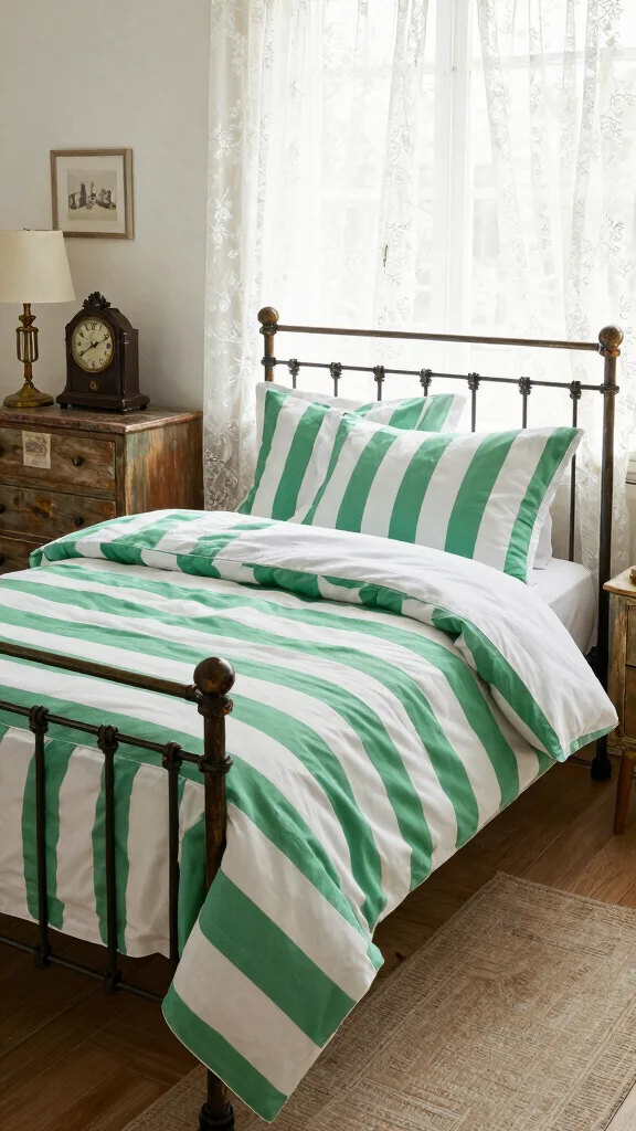 For lovers of vintage aesthetics, green and white striped bedding can beautifully enhance your room’s old-world charm. Consider classic ticking stripes for a timeless look that pairs well with vintage furniture, such as a wrought iron bed frame or a distressed wooden dresser. Adding quirky details like an antique clock or retro lamps completes the nostalgic feel.To style this vintage look, choose light, pastel hues for your stripes to reflect that classic charm. Incorporate mismatched furniture pieces that tell a story, and seek out vintage decor items at flea markets or thrift stores for authentic touches.Use these vintage styling ideas:
