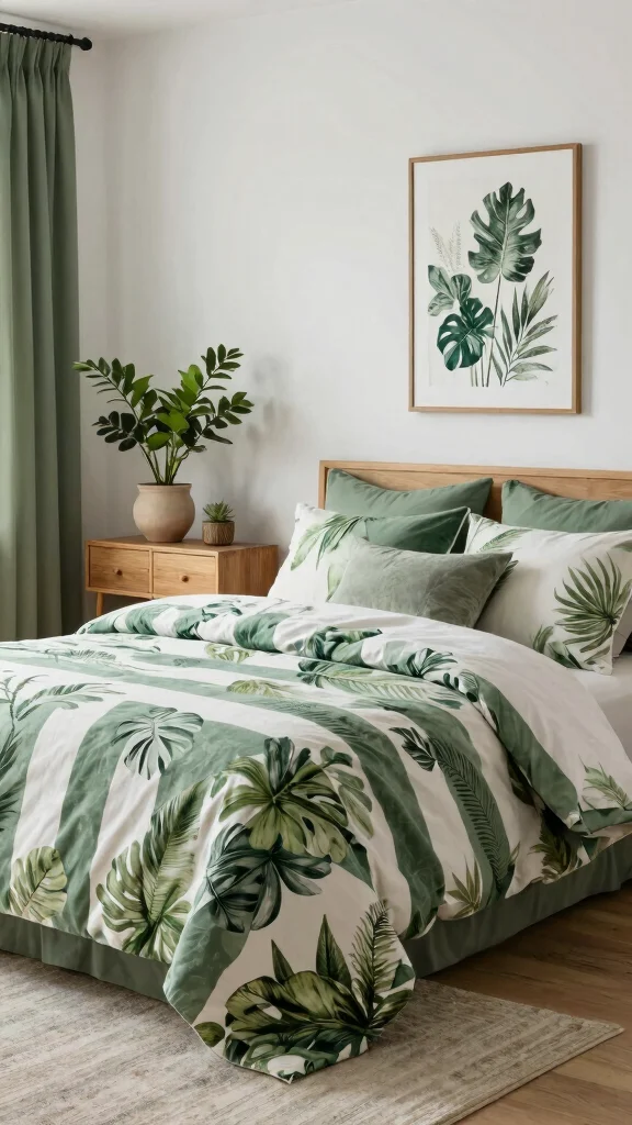 Bring the beauty of the outdoors into your bedroom with nature-inspired green and white striped bedding. Choose shades of green that mirror lush foliage, combined with prints that reflect natural elements like leaves or flowers. This style encourages a relaxing environment, making your bedroom feel like a peaceful sanctuary amidst the hustle of daily life.Incorporate natural wood furniture and soft, organic textures for a cohesive look. Decorate with botanical prints or framed nature photographs to enhance the theme, and consider adding indoor plants for a fresh touch.Consider these nature-themed ideas: