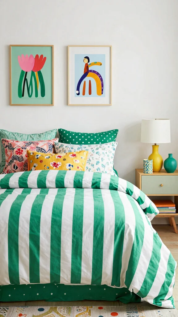 Add a lively touch to your bedroom with playful green and white striped bedding that sparks joy. Choose vibrant shades or bold patterns that make a statement, and pair your bedding with whimsical decor elements like quirky art or colorful accessories. This playful style is perfect for those who want to express their creativity in their space.To enhance this fun vibe, mix your stripes with polka dots or floral designs for a vibrant look. Use playful accessories like plush toys or bright wall art to create an engaging atmosphere, and consider colorful throws or cushions to add depth and character.Incorporate these playful styling tips: