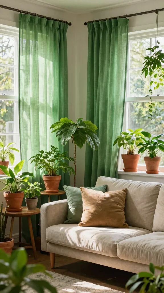 Combining green curtains with a plethora of indoor plants can create a refreshing oasis in your living room. The lush greenery reinforces the natural theme while boosting air quality, making your space feel alive. Picture green curtains framing a window, surrounded by vibrant plants that enhance the lively ambiance.