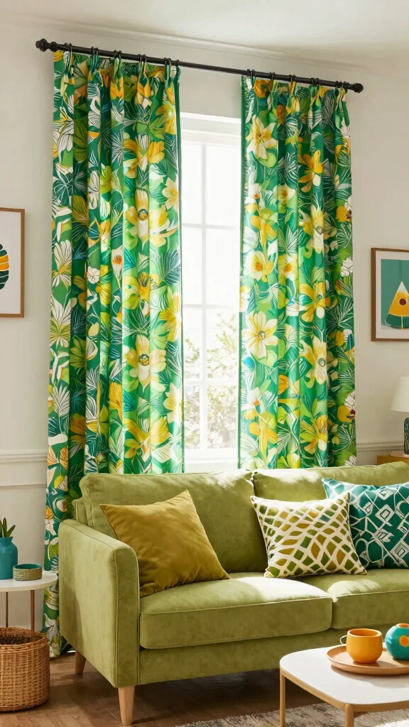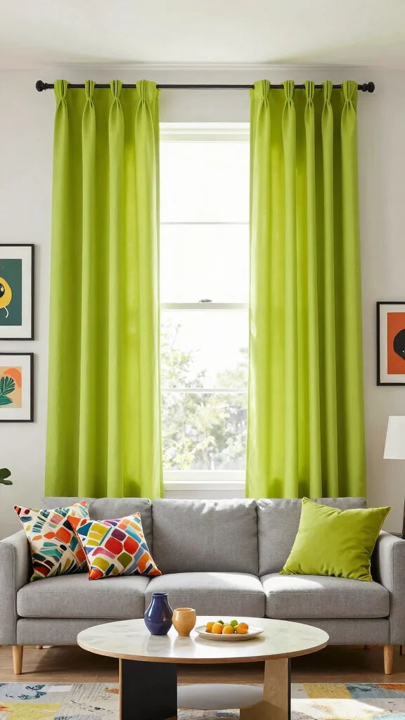 Bright lime green curtains can inject energy into your living room, making them a playful choice for modern or eclectic themes. This vibrant hue revitalizes the space, creating a lively atmosphere perfect for gatherings. Imagine lime curtains adding a pop of color next to bold patterns and unique decor pieces.